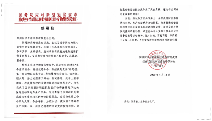 豫西集團(tuán)鄭州紅宇專汽公司收到國(guó)務(wù)院應(yīng)對(duì)新型冠狀病毒肺炎疫情聯(lián)防聯(lián)控機(jī)制醫(yī)療物資保障組發(fā)來的感謝信