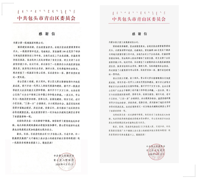 一機(jī)集團(tuán)和北重集團(tuán)收到中共包頭市青山區(qū)委員會(huì)、青山區(qū)人民政府發(fā)來的感謝信和慰問信