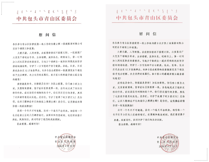 一機(jī)集團(tuán)、北重集團(tuán)收到中共包頭市青山區(qū)委員會(huì)、青山區(qū)人民政府發(fā)來的慰問信