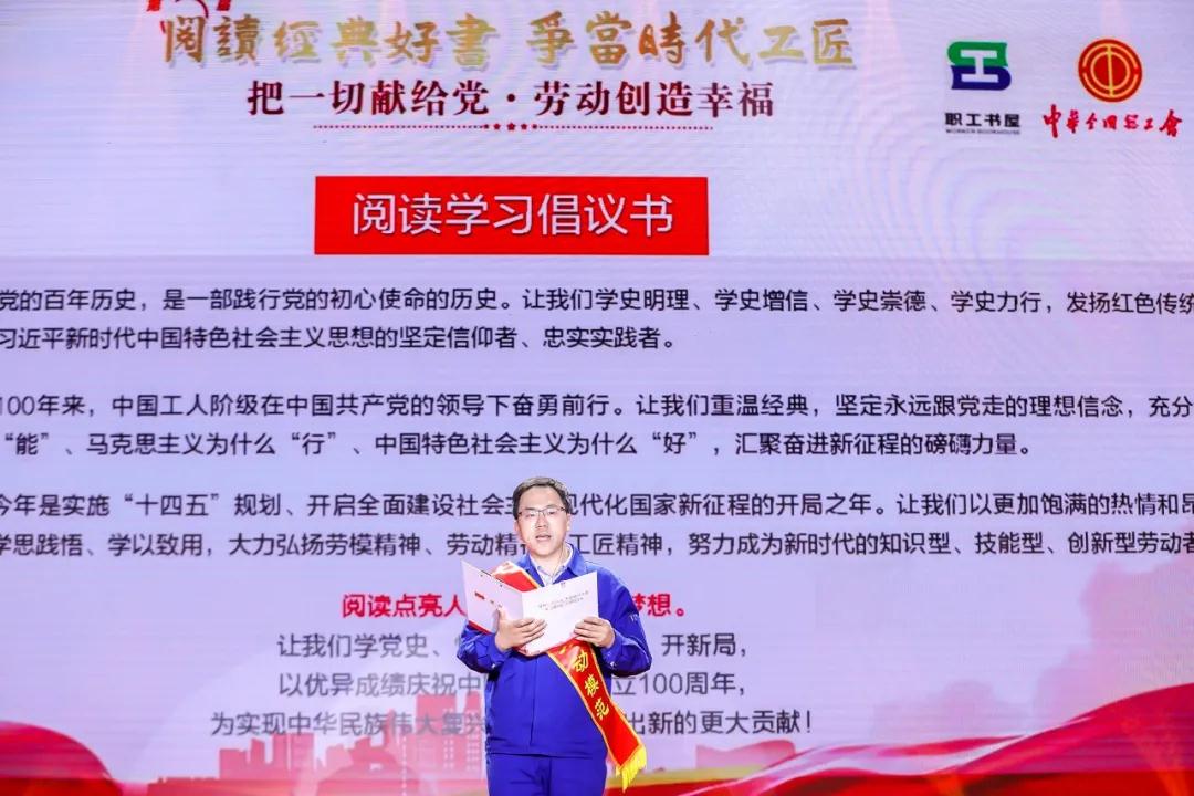 全國(guó)勞動(dòng)模范、兵器工業(yè)集團(tuán)北方車(chē)輛集團(tuán)職工馬小光宣讀參加“把一切獻(xiàn)給黨·勞動(dòng)創(chuàng)造幸福”全國(guó)職工黨史學(xué)習(xí)教育讀書(shū)活動(dòng)倡議書(shū)