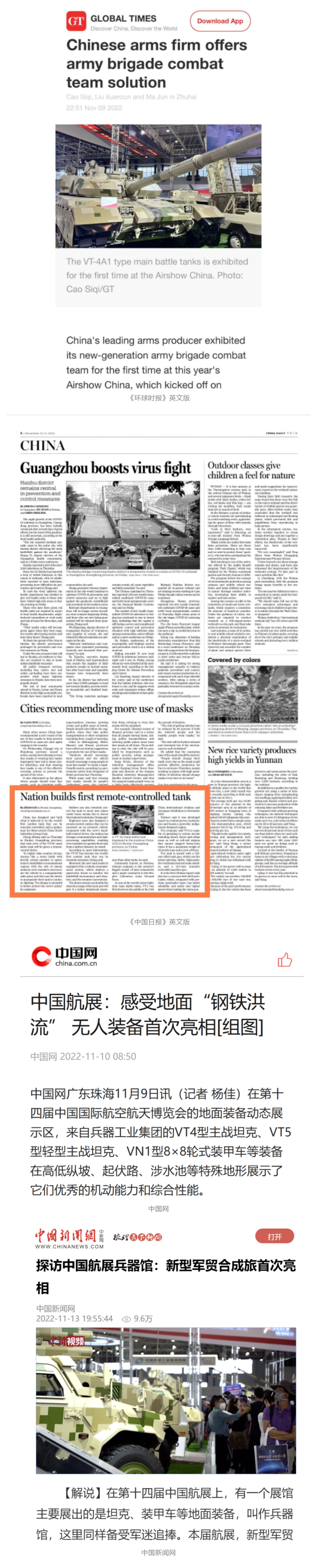 央視國防軍事頻道航展特別報道《炫舞天地間》11月12日《賞“鐵甲雄風(fēng)”!看航展地面裝備“鋼鐵洪流”名場面》對兵器工業(yè)集團(tuán)武器裝備特色亮點進(jìn)行報道。《國防軍事早報》11月7日推出報道《第十四屆中國國際航空航天博覽會明天開幕 中國兵器館首次以陸軍合成旅實戰(zhàn)體系形式展出》,對兵器館陸軍合成旅實戰(zhàn)體系進(jìn)行報道?!盾娛聢蟮馈?1月9日推出《第十四屆中國國際航空航天博覽會 地面兵器裝備首次聯(lián)合陸航直升機(jī)進(jìn)行動態(tài)展示》報道?!盾娒孕刑煜隆?1月9日推出報道《軍迷打卡航展2022》以專業(yè)軍迷視角探館兵器館,全面展示兵器工業(yè)集團(tuán)參展裝備特色亮點。