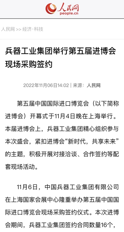 人民網(wǎng):兵器工業(yè)集團(tuán)舉行第五屆進(jìn)博會現(xiàn)場采購簽約