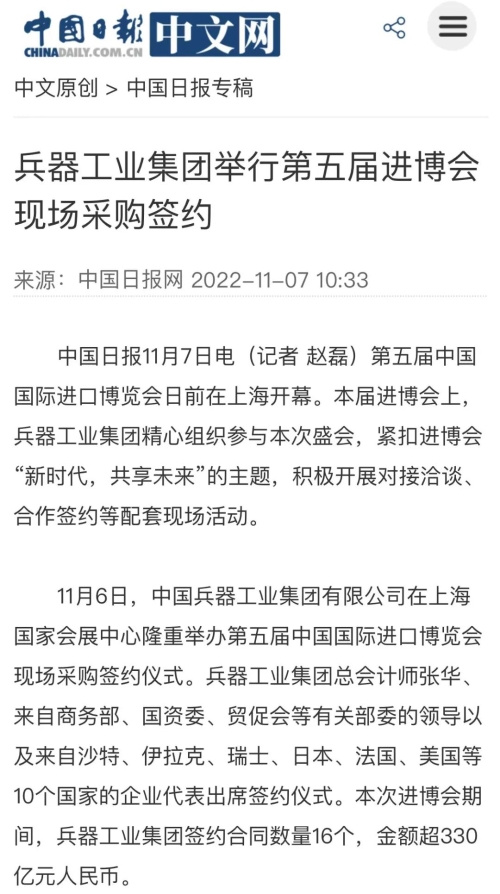 中國日報(bào)網(wǎng):兵器工業(yè)集團(tuán)舉行第五屆進(jìn)博會現(xiàn)場采購簽約
