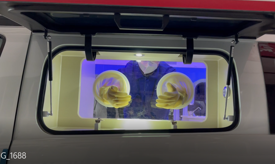 核酸采樣車采用福特新全順中軸中頂汽油款底盤,外觀與普通救護車類似,內(nèi)部上裝醫(yī)療輔助系統(tǒng)、空調(diào)系統(tǒng)、照明系統(tǒng)、新風過濾系統(tǒng)等。其中,最為核心的醫(yī)療輔助系統(tǒng)包括采樣窗口、隔離手套、車載冰箱、洗手池系統(tǒng)、凈水桶、污水箱、污物桶、車載飲水機等。