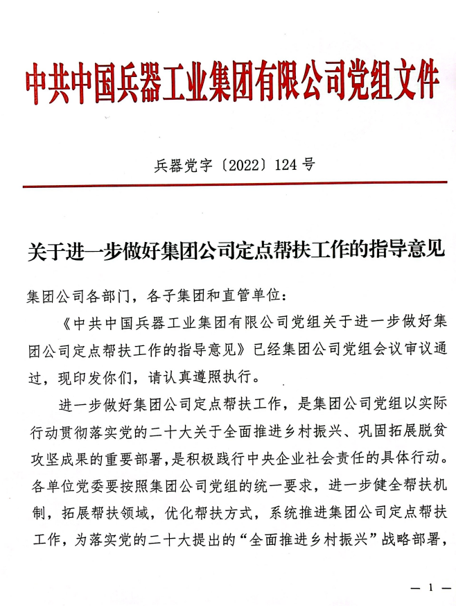 2022年,根據(jù)《中共中央 國(guó)務(wù)院關(guān)于實(shí)現(xiàn)鞏固拓展脫貧攻堅(jiān)成果同鄉(xiāng)村振興有效銜接的意見》《關(guān)于堅(jiān)持做好中央單位定點(diǎn)幫扶工作的意見》等規(guī)定,兵器工業(yè)集團(tuán)黨組制訂印發(fā)《關(guān)于進(jìn)一步做好集團(tuán)公司定點(diǎn)幫扶工作的指導(dǎo)意見》,形成“1+8+5”兵器特色定點(diǎn)幫扶工作體系?!?”,即圍繞“助力全面推進(jìn)鄉(xiāng)村振興、建設(shè)宜居宜業(yè)和美鄉(xiāng)村”定點(diǎn)幫扶要求,“8”,即“加強(qiáng)系統(tǒng)策劃、完善幫扶長(zhǎng)效機(jī)制,發(fā)揮比較優(yōu)勢(shì)、助力鄉(xiāng)村產(chǎn)業(yè)振興,增強(qiáng)內(nèi)生動(dòng)力、助力鄉(xiāng)村人才振興,培育文明新風(fēng)、助力鄉(xiāng)村文化振興,踐行‘兩山’理論、助力鄉(xiāng)村生態(tài)振興,加強(qiáng)基層黨建、助力鄉(xiāng)村組織振興,鞏固脫貧成果、加大消費(fèi)幫扶力度,選派掛職干部、立足鄉(xiāng)村建功立業(yè)”等八項(xiàng)重點(diǎn)任務(wù),“5”,即加強(qiáng)組織領(lǐng)導(dǎo)、落實(shí)幫扶資金、做好宣傳引導(dǎo)、增進(jìn)工作交流、強(qiáng)化考核評(píng)價(jià)等五方面工作保障。