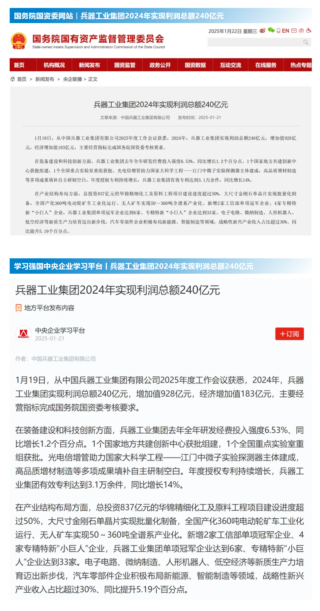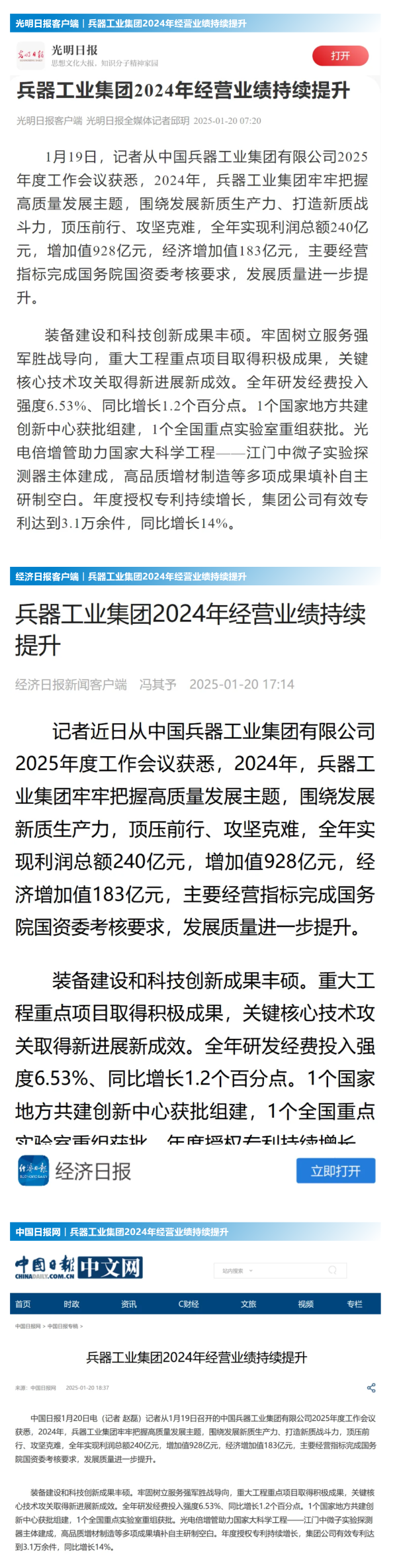 中國新聞網(wǎng):兵器工業(yè)集團(tuán)2024年實現(xiàn)利潤總額240億元2025-01-20