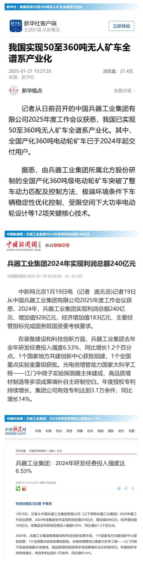 集團(tuán)公司2024年取得的成績及下一步重點工作受到社會媒體廣泛關(guān)注。新華社、中國新聞網(wǎng)、中國科技網(wǎng)、光明日報客戶端、經(jīng)濟(jì)日報客戶端、中國日報網(wǎng)、國務(wù)院國資委網(wǎng)站、學(xué)習(xí)強國中央企業(yè)學(xué)習(xí)平臺、新浪網(wǎng)、網(wǎng)易網(wǎng)、搜狐網(wǎng)、騰訊網(wǎng)、鳳凰網(wǎng)等中央主流媒體、國家部委網(wǎng)站及知名網(wǎng)絡(luò)媒體對集團(tuán)公司2025年度工作會議進(jìn)行了報道,重點關(guān)注集團(tuán)公司經(jīng)營業(yè)績、科技創(chuàng)新、產(chǎn)業(yè)結(jié)構(gòu)布局優(yōu)化等情況。其中,新華社以《我國實現(xiàn)50至360噸無人礦車全譜系產(chǎn)業(yè)化》為題,重點報道了集團(tuán)公司在推動智能制造水平提升方面取得的成效;中國新聞網(wǎng)、光明日報客戶端、經(jīng)濟(jì)日報客戶端、中國日報網(wǎng)等就集團(tuán)公司2024年度經(jīng)營業(yè)績及各項工作取得的成果進(jìn)行報道;中國科技網(wǎng)著重報道了集團(tuán)公司在科技創(chuàng)新和優(yōu)化產(chǎn)業(yè)結(jié)構(gòu)布局方面的最新進(jìn)展。集團(tuán)公司門戶網(wǎng)站、微信公眾號、微博等新媒體平臺以及《中國兵工報》也對集團(tuán)公司工作會議進(jìn)行了及時報道,各成員單位紛紛對相關(guān)內(nèi)容進(jìn)行轉(zhuǎn)載,引發(fā)全系統(tǒng)關(guān)注。
