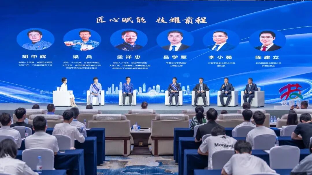 光電集團(tuán)梁兵(左三)在第三屆大國(guó)工匠創(chuàng)新交流大會(huì)暨大國(guó)工匠論壇河南省分論壇分享職工技能提升的實(shí)踐經(jīng)驗(yàn)