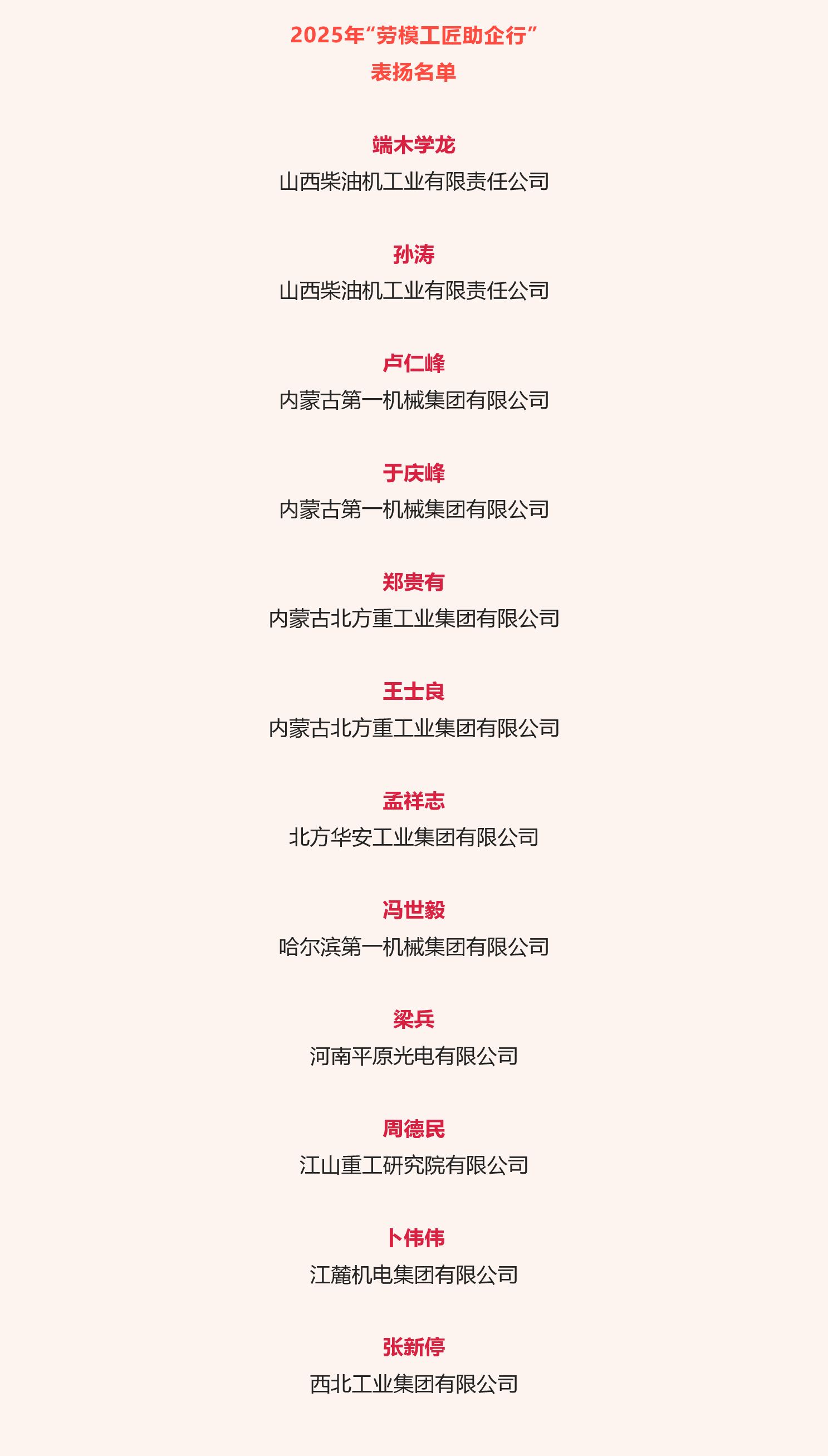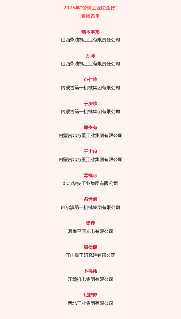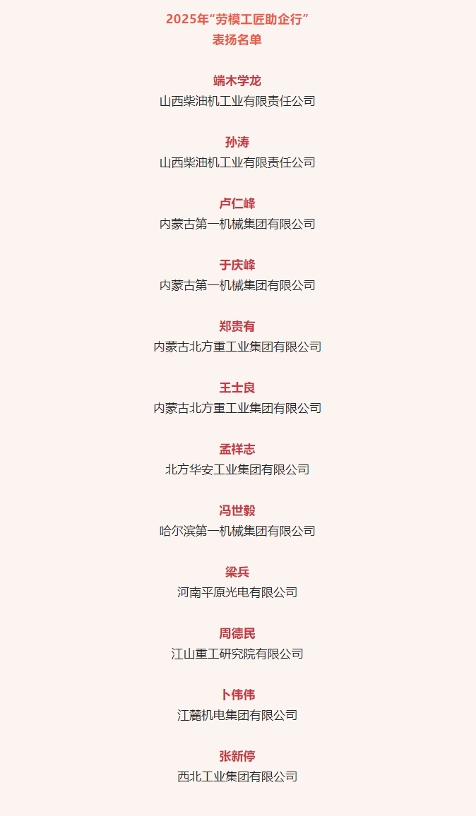 近日,中華全國總工會公布2025年“勞模工匠助企行”表揚(yáng)名單,兵器工業(yè)集團(tuán)12名勞模工匠入選。